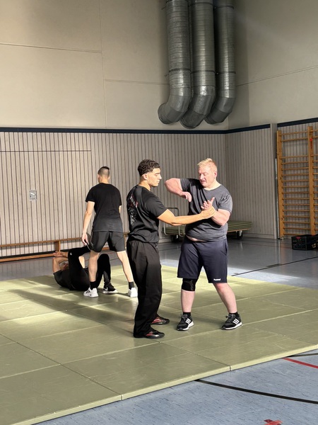 5 Stunden zeigte Erwin verschiedene SV Techniken aus dem Ju-Jitsu und Hapkido, sowie Trainingstools und SV gegen Stockangriffe / Nervenpunkte und Energielehre.